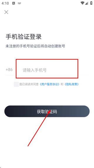 3、在手機驗證登錄頁面填寫手機號,勾選協(xié)議后,點擊獲取驗證碼。