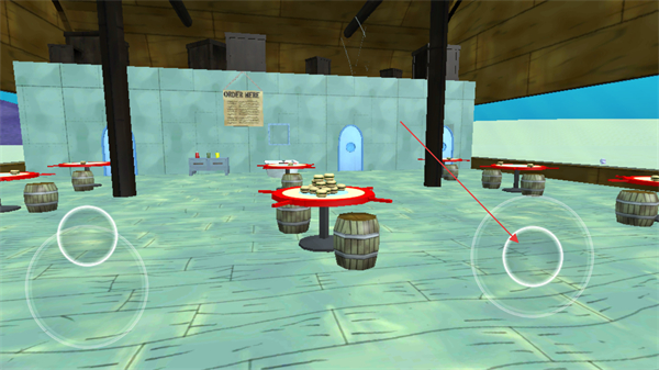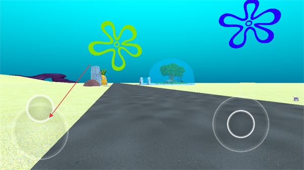 1、進(jìn)入海綿寶寶宇宙搖擺游戲后,通過(guò)左下角方向輪盤(pán)控制角色在海底世界中移動(dòng)。