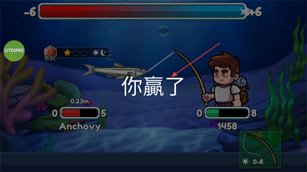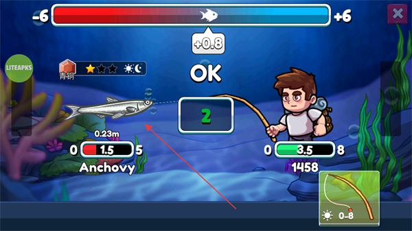 4、持續(xù)調(diào)整力度直至魚的體力耗盡,成功釣起魚后獲得獎勵,推進(jìn)游戲進(jìn)度。