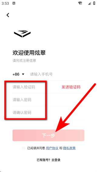 4、輸入驗(yàn)證碼,設(shè)置密碼,勾選協(xié)議后,點(diǎn)擊下一步,完成注冊(cè)操作。