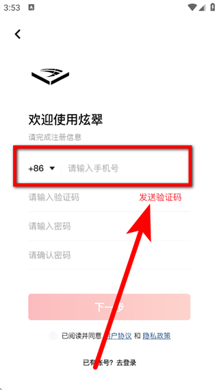 3、在注冊(cè)頁(yè)面,輸入手機(jī)號(hào),點(diǎn)擊發(fā)送驗(yàn)證碼。