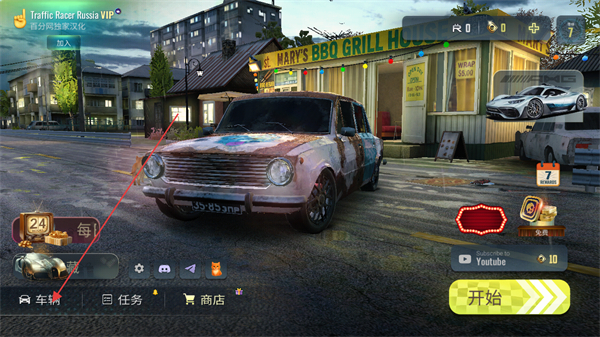 1、在俄羅斯鄉(xiāng)村賽車手主界面,點擊車輛進入車輛選擇界面,也可點擊開始進入模式選擇環(huán)節(jié),同時可借助界面功能按鈕輔助操作。
