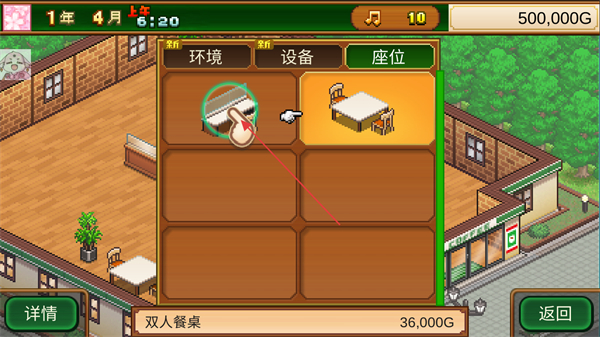 2、在座位分類中選擇雙人餐桌,消耗36000G選定該設(shè)施。