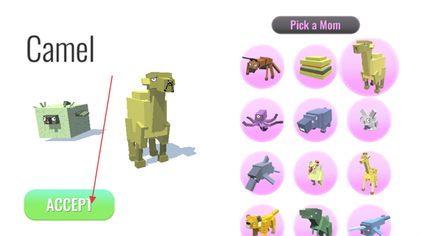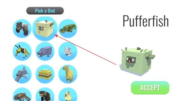 1、在PickaDad界面選擇對(duì)應(yīng)動(dòng)物,點(diǎn)擊ACCEPT確定父方角色。