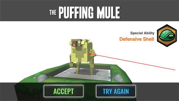4、合成出THEPUFFINGMULE,其技能為DefensiveShell,點(diǎn)擊ACCEPT完成合成。
