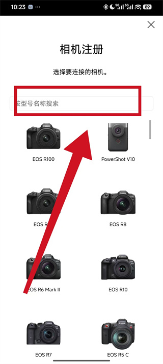 3、在相機(jī)注冊(cè)頁面,通過搜索框查找或直接選擇要連接的相機(jī)型號(hào)。