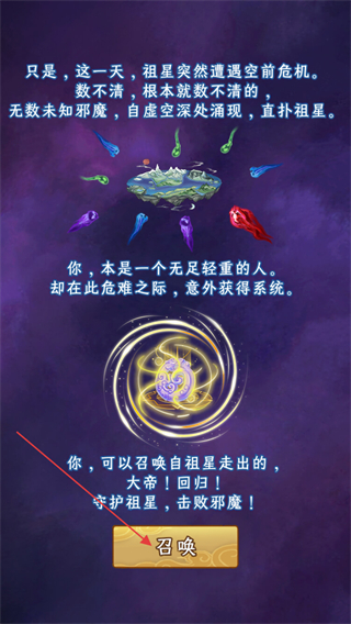 1、在劇情界面了解祖星遭遇危機(jī)的背景后,點(diǎn)擊界面中的召喚按鈕,即可召喚自祖星走出的大帝,開啟守護(hù)祖星的進(jìn)程。