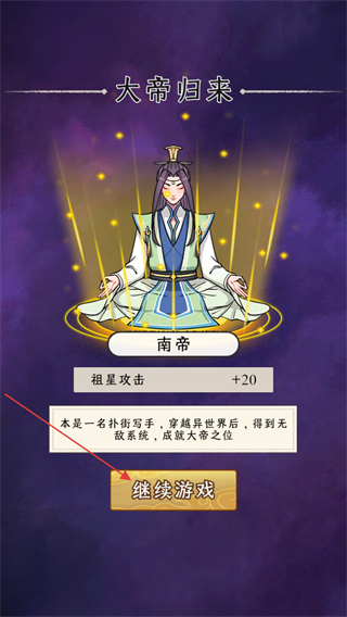 2、成功召喚出南帝后,查看其祖星攻擊+20的屬性,點(diǎn)擊界面中的繼續(xù)游戲按鈕,推進(jìn)至后續(xù)游戲環(huán)節(jié)。