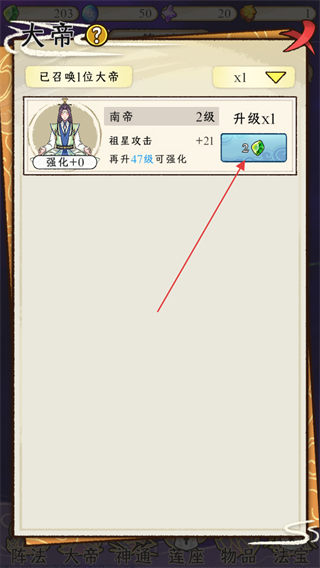 3、進(jìn)入大帝界面,找到已召喚的南帝,點(diǎn)擊對應(yīng)的升級按鈕,消耗道具提升其等級,增強(qiáng)祖星攻擊等屬性。