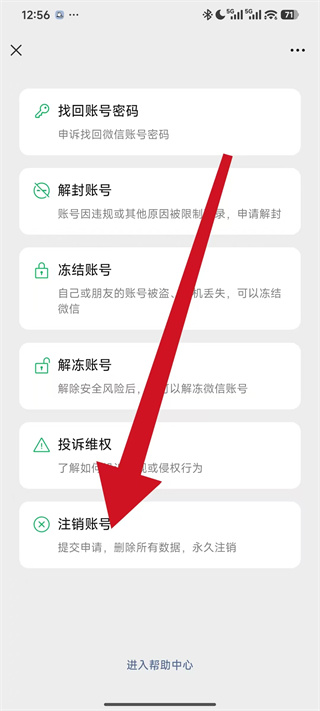 5、在微信安全中心頁面,選擇注銷賬號(hào),進(jìn)入申請(qǐng)注銷微信賬號(hào)頁面。
