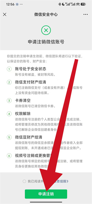 6、確認(rèn)賬號(hào)滿足注銷條件,勾選相關(guān)協(xié)議后,點(diǎn)擊申請(qǐng)注銷,即可提交微信賬號(hào)的注銷申請(qǐng)。