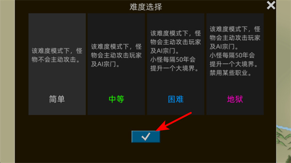 2、進入難度選擇界面后,選定對應(yīng)難度并點擊確認(rèn),這是確定游戲挑戰(zhàn)強度的核心操作,對應(yīng)不同的怪物行為獲取規(guī)則,匹配節(jié)奏選擇。