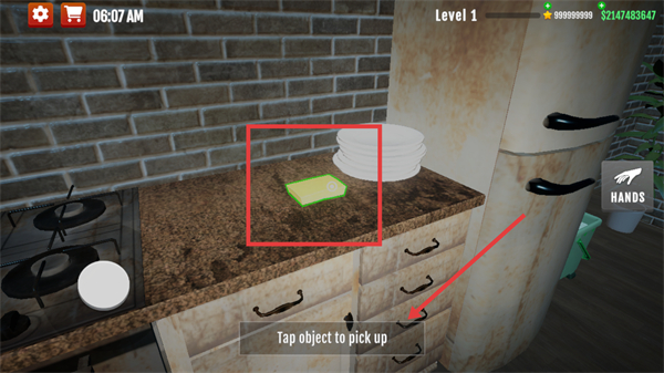 1、觀察廚房臺(tái)面區(qū)域,找到黃色清潔物品,點(diǎn)擊該物品完成拾取。