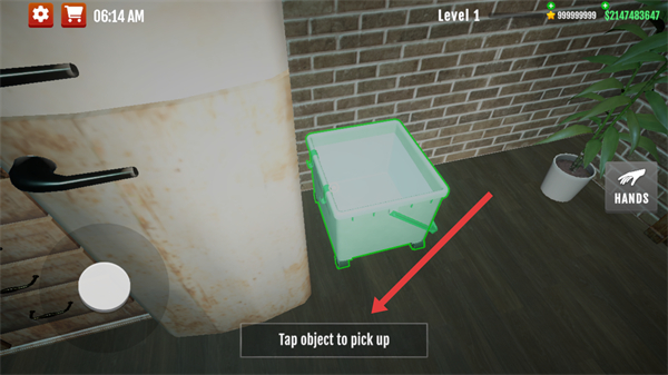 2、移動(dòng)視角至廚房地面區(qū)域,找到淺綠色收納箱,點(diǎn)擊該箱子完成拾取。