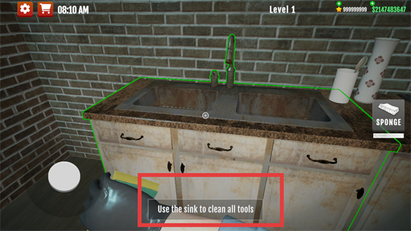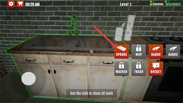 4、按照提示操作,將選中的海綿工具用于水槽區(qū)域,對(duì)水槽進(jìn)行清潔處理。