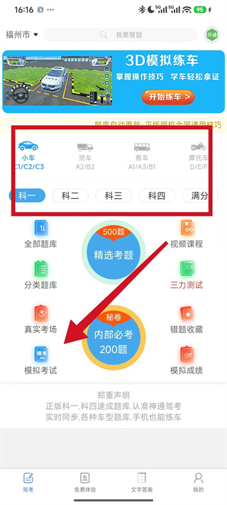1、打開神通駕考APP,在首頁選擇目標(biāo)車型和要練習(xí)的科目,在頁面中找到模擬考試選項(xiàng)并點(diǎn)擊進(jìn)入。