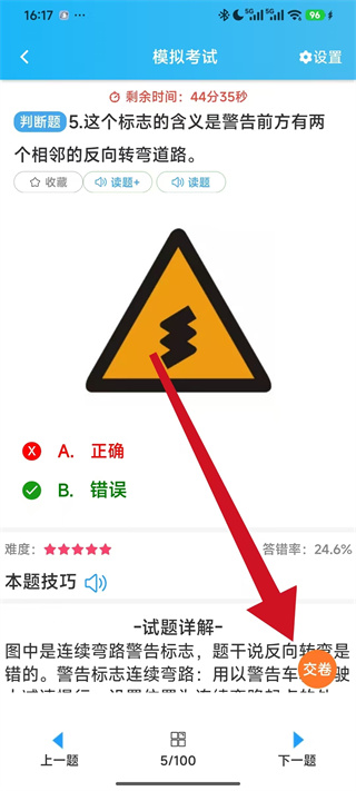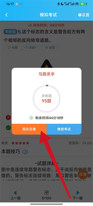 4、點(diǎn)擊頁面中的交卷后,再選擇現(xiàn)在交卷,即可完成本次模擬考試。