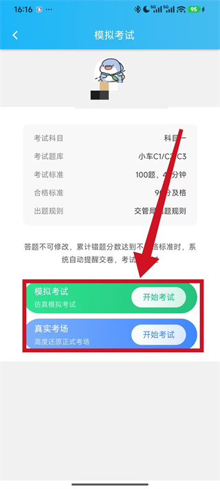 2、進(jìn)入模擬考試后,然后選擇模擬考試或真實(shí)考場(chǎng)對(duì)應(yīng)的開始考試。