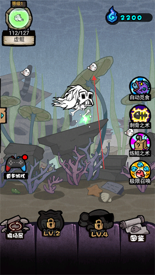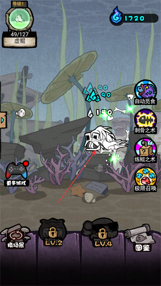 1、在等級(jí)1中,鯤自動(dòng)攻擊獲取資源,界面顯示49/127進(jìn)度,可使用右側(cè)功能輔助。