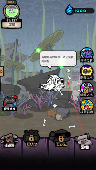 2、鯤提示吞噬是進(jìn)化目標(biāo),繼續(xù)讓鯤吞噬,進(jìn)度更新為91/127,積累資源。