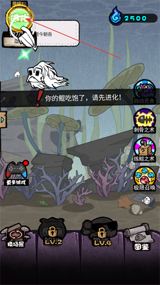 4、鯤吃飽后,點(diǎn)擊左上角進(jìn)化按鈕,觸發(fā)進(jìn)化提示,推進(jìn)鯤的進(jìn)化流程。