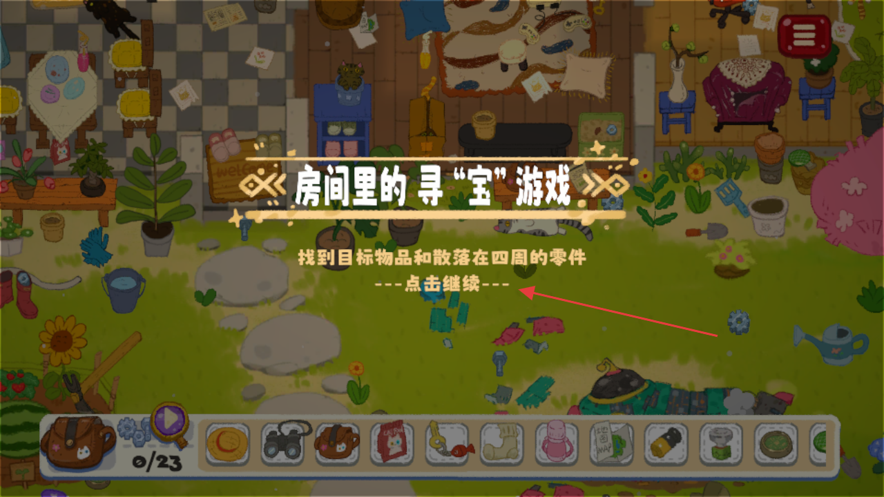 1、點擊點擊繼續(xù)進入房間里的尋寶游戲,需找目標物品和零件,開始探索場景。