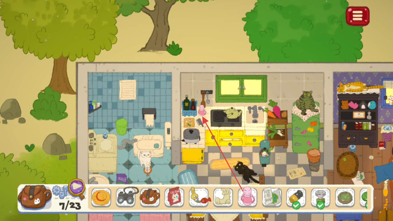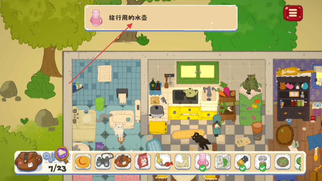 2、在廚房場景中,點擊目標物品如粉色水壺,收集后進度變?yōu)?/23,繼續(xù)尋找物品。