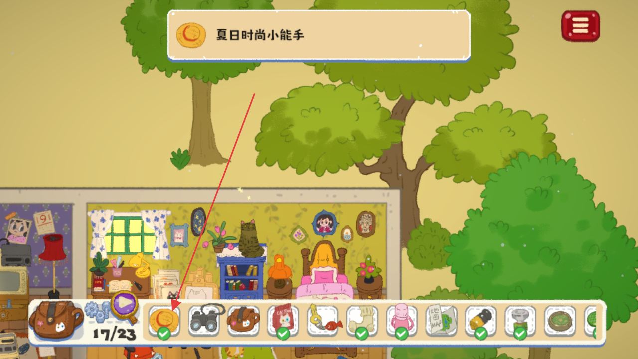 4、在臥室場景找到夏日時尚小能手物品,收集后進度變?yōu)?7/23,繼續(xù)探索收集剩余物品。