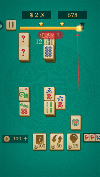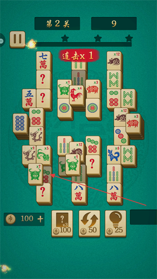 1、在第2關中,點擊相同圖案的麻將牌消除,觸發(fā)連擊x1,分數(shù)升至9。