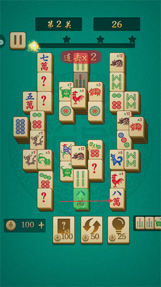 2、繼續(xù)消除相同牌,觸發(fā)連擊x2,分數(shù)漲至26,推進關卡進度。