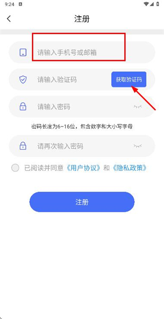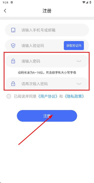 3、在注冊賬號頁面填寫驗證碼和密碼,勾選協(xié)議后點擊注冊完成賬號注冊操作。
