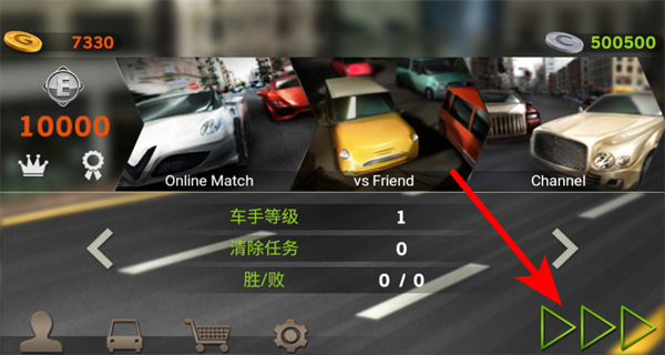 1、進入游戲主界面后,點擊右下角的綠色箭頭按鈕,這是進入駕駛對局的關(guān)鍵操作,點擊后可開啟賽車駕駛挑戰(zhàn)。