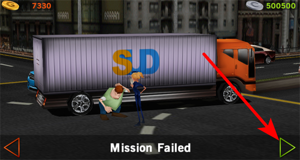 4、若出現(xiàn)Mission Failed任務(wù)失敗提示,點擊界面右下角的綠色箭頭,重新開啟駕駛挑戰(zhàn)的操作,可再次嘗試完成對局。