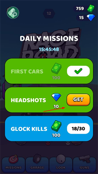 4、打開DAILY MISSIONS界面,完成已達(dá)成的任務(wù),點(diǎn)擊GET領(lǐng)取獎勵(lì),積累游戲資源。