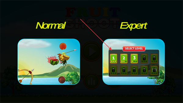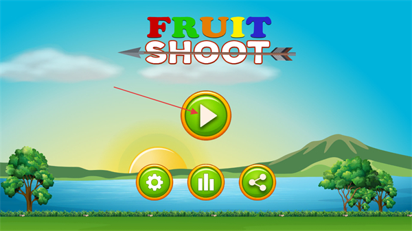 1、進入水果射擊啟動界面后,點擊界面中的綠色播放按鈕,即可進入游戲的難度與關卡選擇環(huán)節(jié)。
