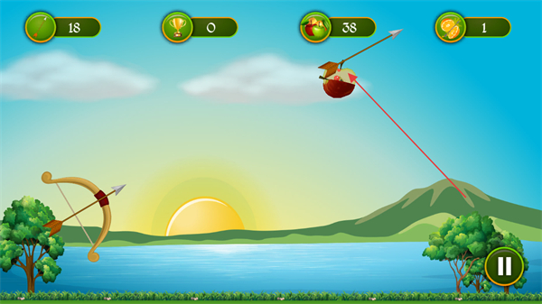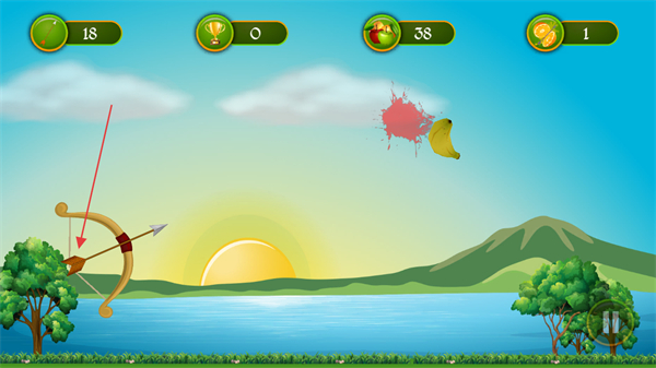 3、進入游戲游玩界面后,操控弓箭瞄準空中的水果,發(fā)射弓箭擊中水果,以此積累分數(shù)推進游戲。