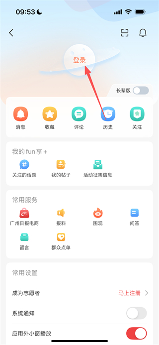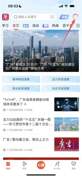 1、在廣州日?qǐng)?bào)新花城首頁(yè),點(diǎn)擊右上角的個(gè)人頭像,進(jìn)入個(gè)人中心頁(yè)面。