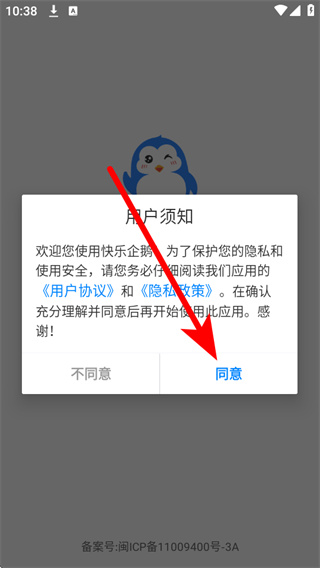 1、打開快樂企鵝,在彈窗中點(diǎn)擊同意按鈕,進(jìn)入應(yīng)用首頁。
