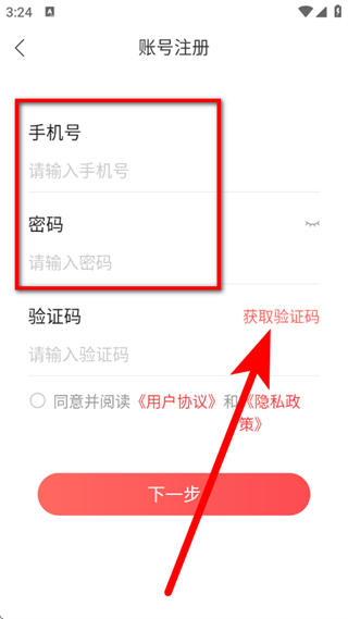3、在注冊(cè)頁面,輸入手機(jī)號(hào)和密碼后,點(diǎn)擊獲取驗(yàn)證碼。