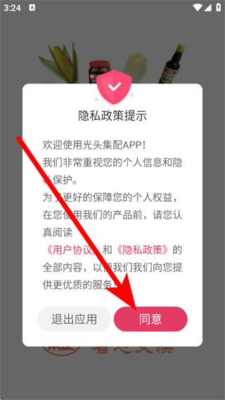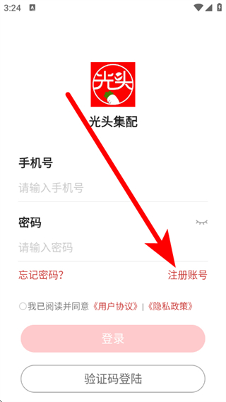 1、打開光頭集配,在彈出隱私政策提示框,點(diǎn)擊同意,進(jìn)入登錄界面。