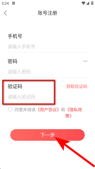 4、在輸入框輸入驗(yàn)證碼,勾選協(xié)議后,點(diǎn)擊下一步,完成注冊(cè)。