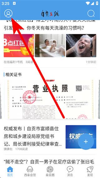 1、打開自貢在線,點(diǎn)擊左上角頭像圖標(biāo),進(jìn)入我的頁面。