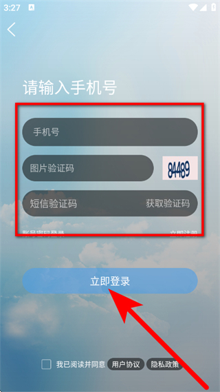 4、輸入手機(jī)號,輸入驗(yàn)證碼,勾選協(xié)議,點(diǎn)擊立即登錄,完成登錄。