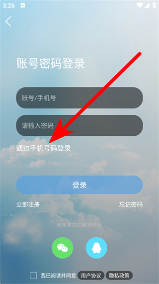 3、在登錄頁面,點(diǎn)擊通過手機(jī)號碼登錄,進(jìn)入手機(jī)號登錄頁面。