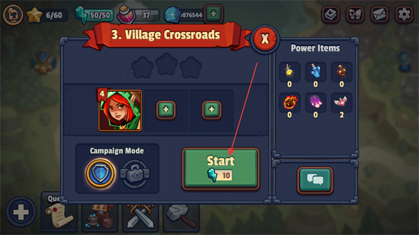 1、當(dāng)前界面是關(guān)卡界面,可看到角色及道具欄,點(diǎn)擊Start按鈕消耗10能量開(kāi)啟關(guān)卡,也可通過(guò)CampaignMode按鈕切換模式,完成后進(jìn)入關(guān)卡游玩。