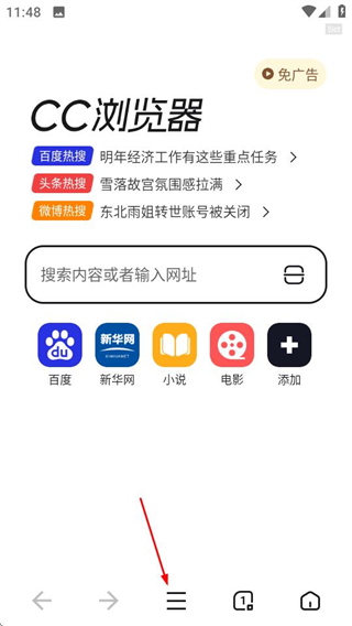 1、在CC瀏覽器首頁,點擊底部的菜單按鈕,展開功能菜單。