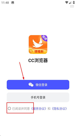 3、在登錄頁面,勾選協(xié)議后選擇微信登錄,完成微信登錄操作。