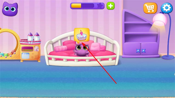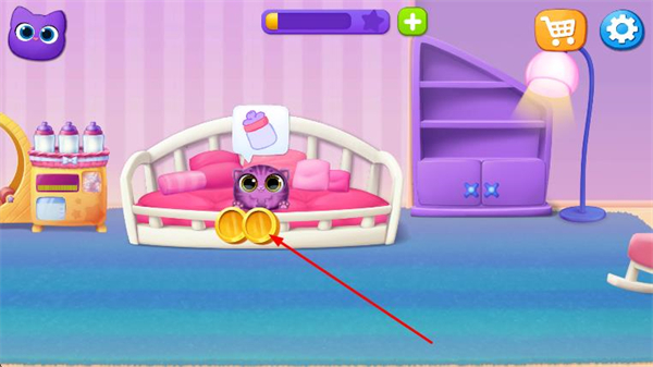 1、在貓咪房間界面,點(diǎn)擊金幣道具,利用獲取到的資源照顧貓咪。