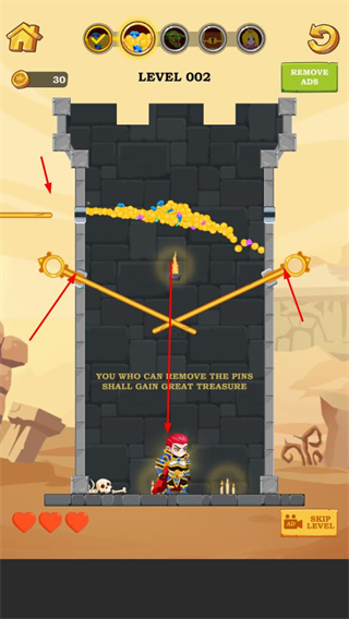 1、關(guān)卡中觀察機關(guān)布局,選擇合適順序拔針,讓寶藏沿路徑下落至角色處,這是獲取獎勵的核心操作。