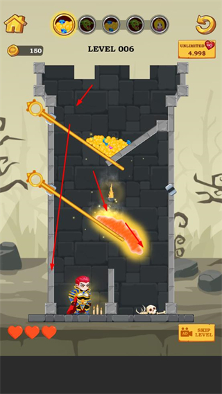 3、面對火焰等危險元素,需先處理障礙,再按順序拔針引導(dǎo)資源下落,同時保護角色不受傷害。